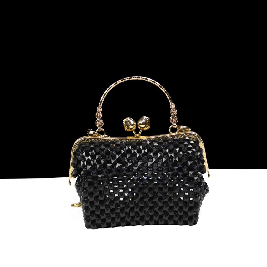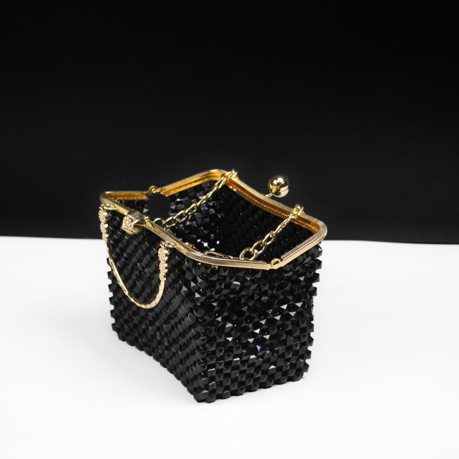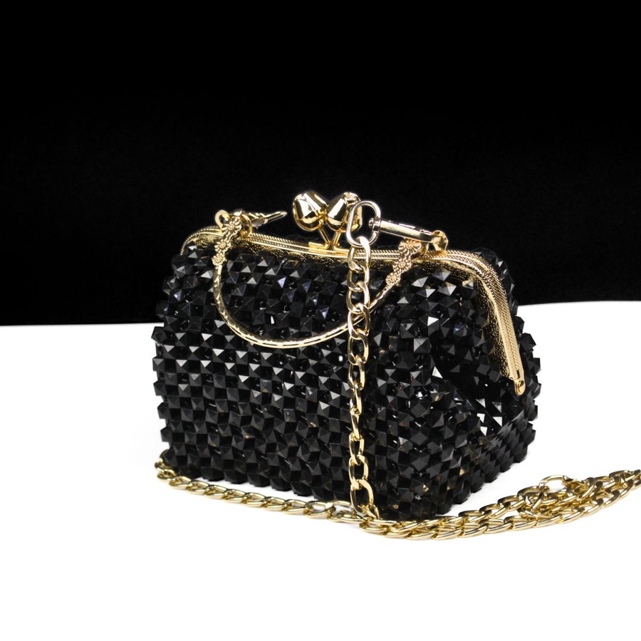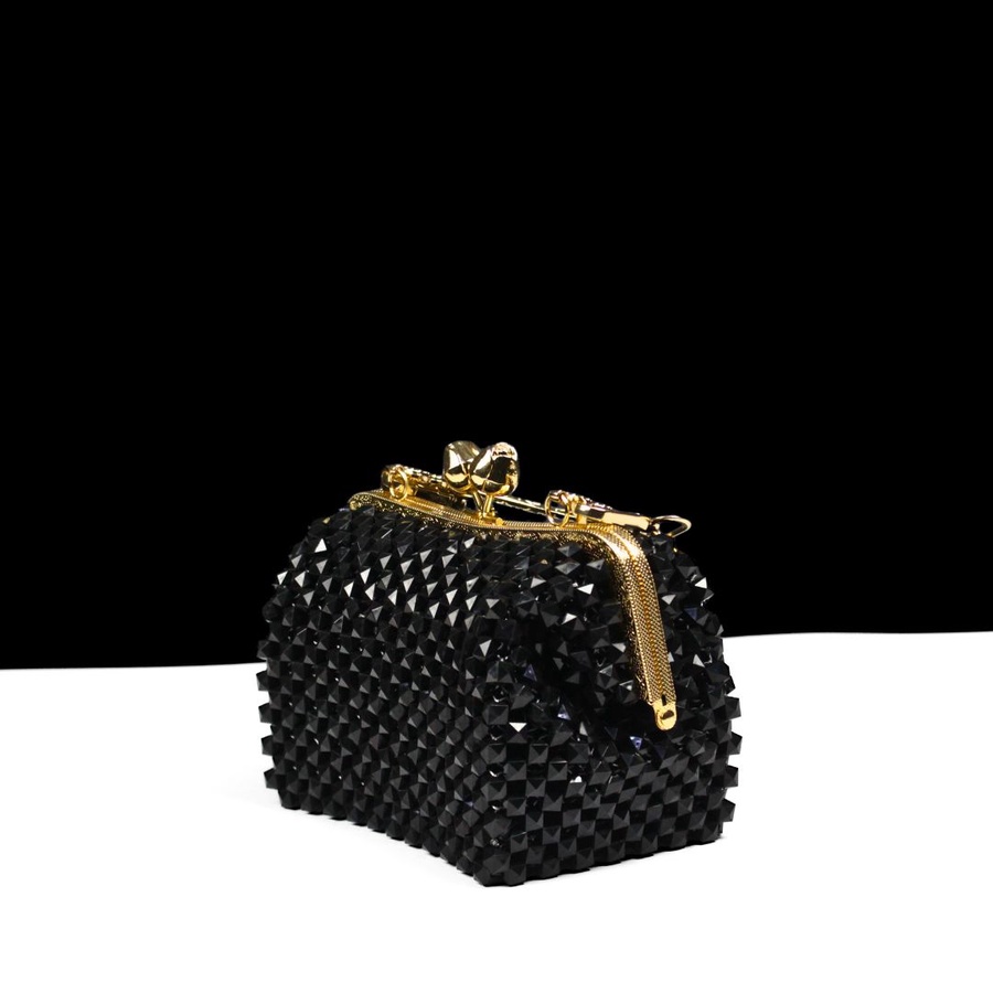 تتميز الحقيبة بتصميم عصري مرصع بالكريستال اللامع مع إطار معدني ذهبي راقٍ يمنحك مظهرًا ملكيًا يخطف الأنظار في كل ظهور.