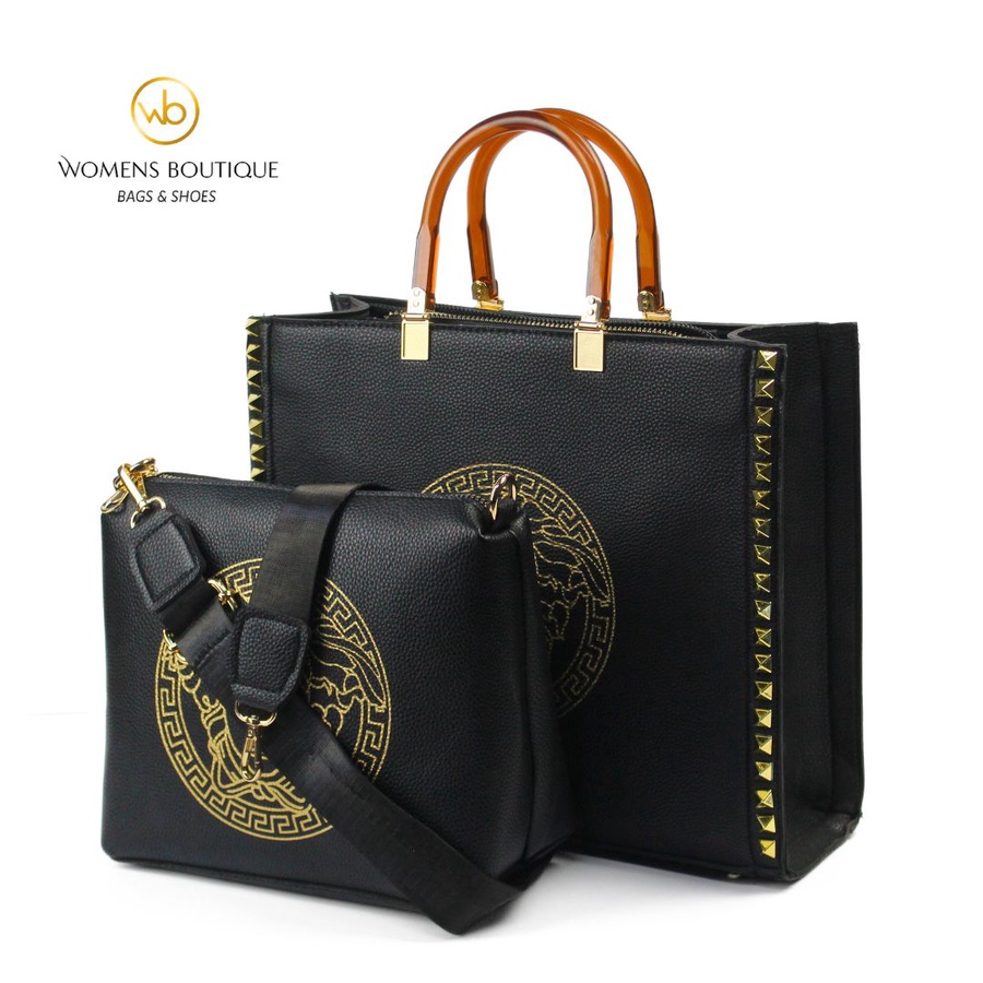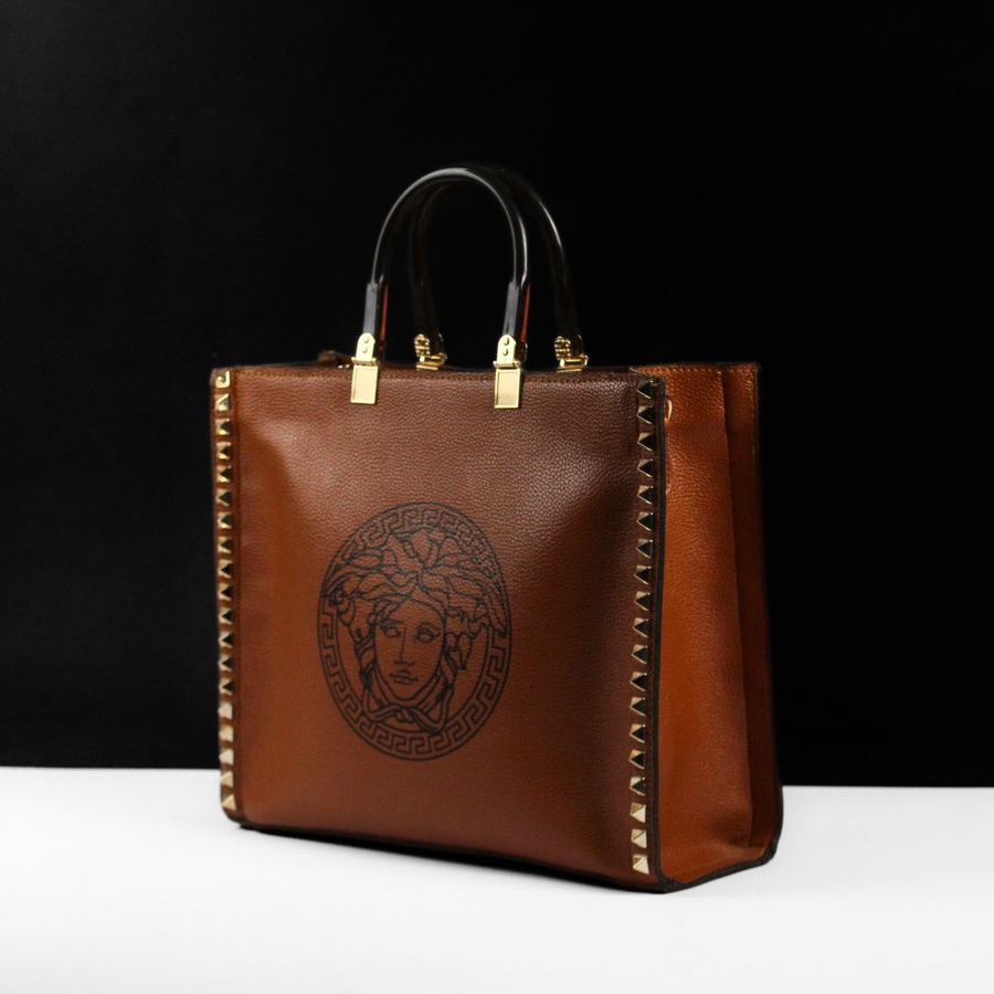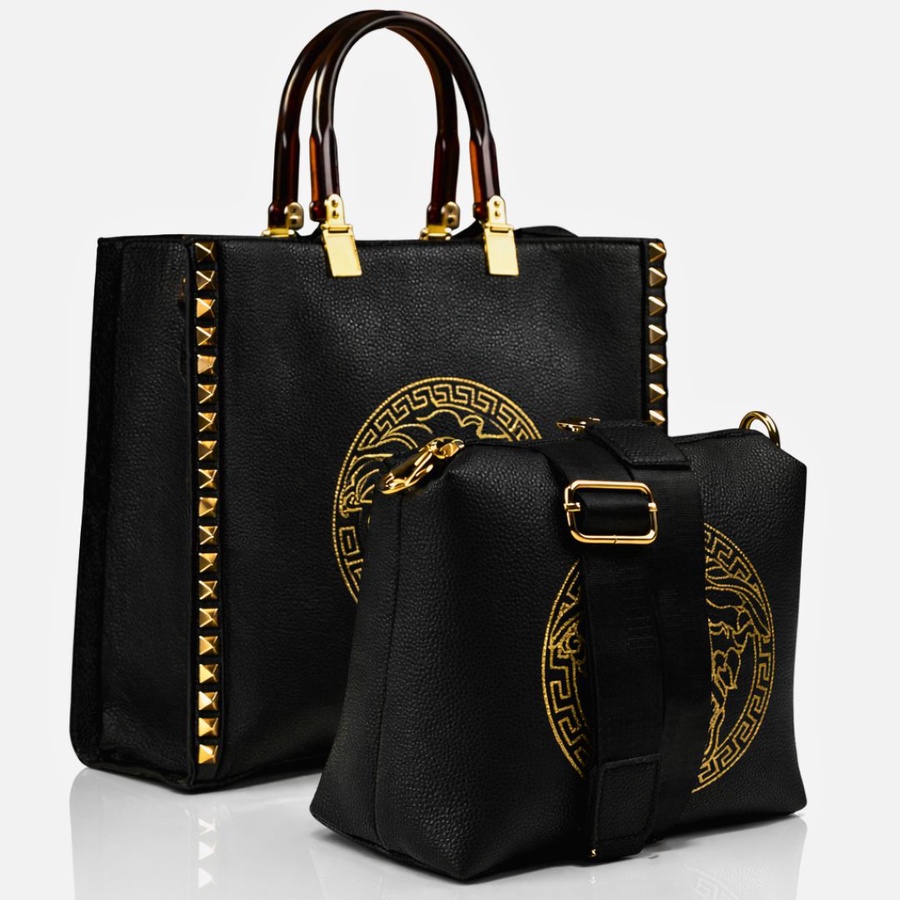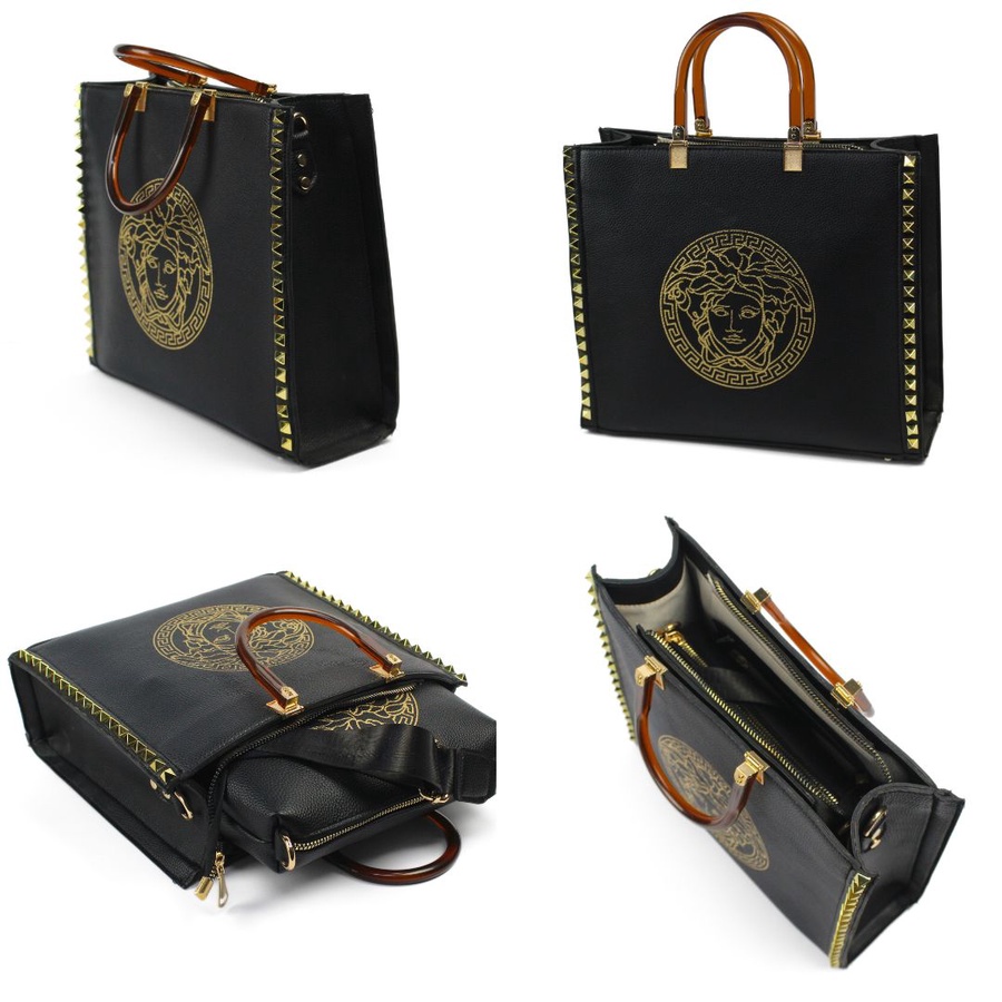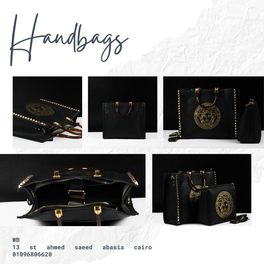 ✨ الوصف العام: اكتشف مجموعة WB الجديدة من حقائب اليد النسائية، المصممة بعناية لتجمع بين الفخامة والعملية. كل حقيبة تتميز بتصميم هندسي أنيق، مزينة بشعار الرأس الأسطوري المحاط بنقوش يونانية، مع لمسات من المسامير الذهبية التي تضيف طابعًا جريئًا ومميزًا.