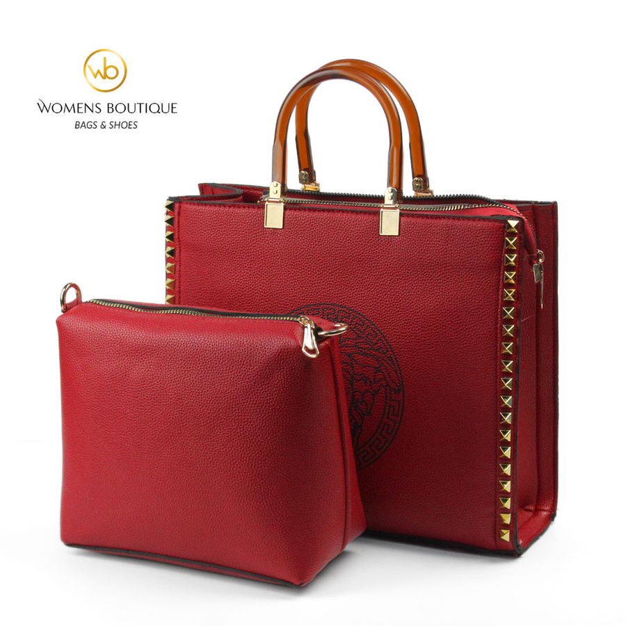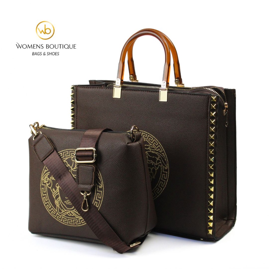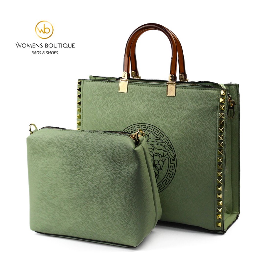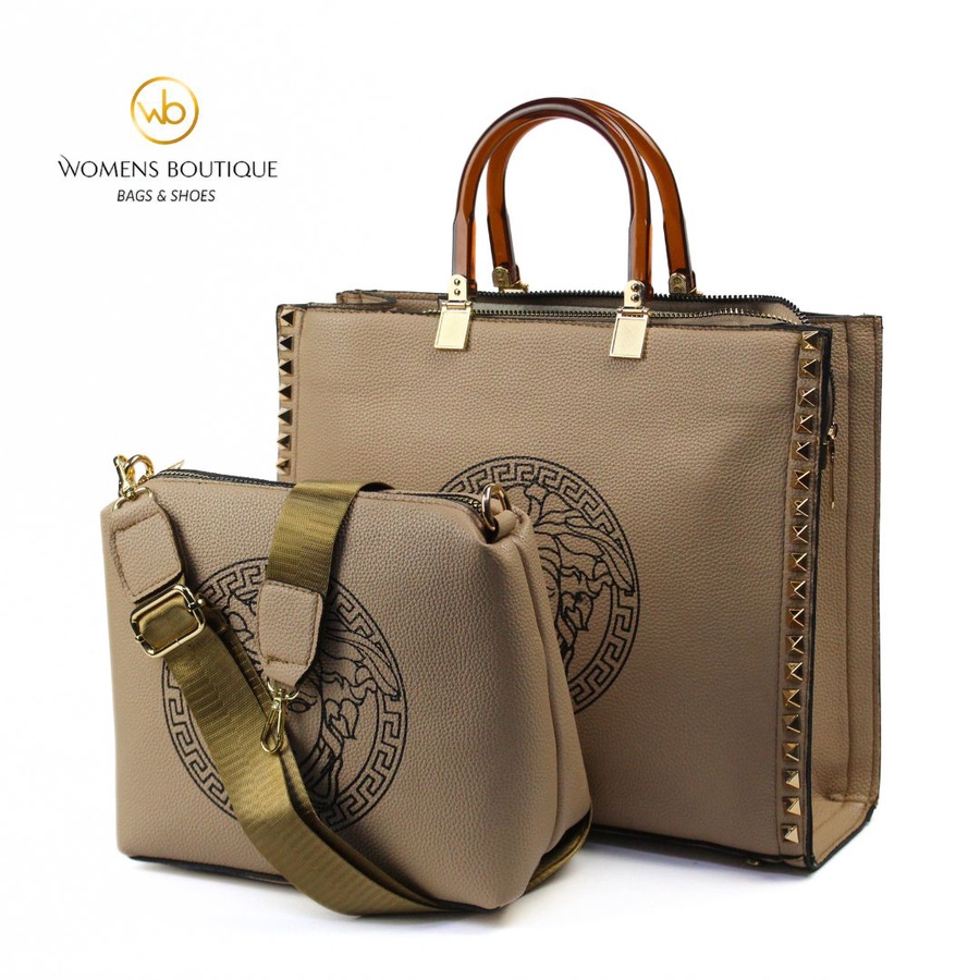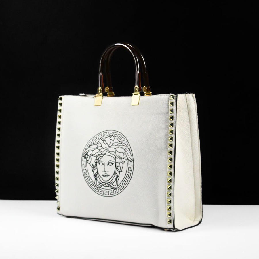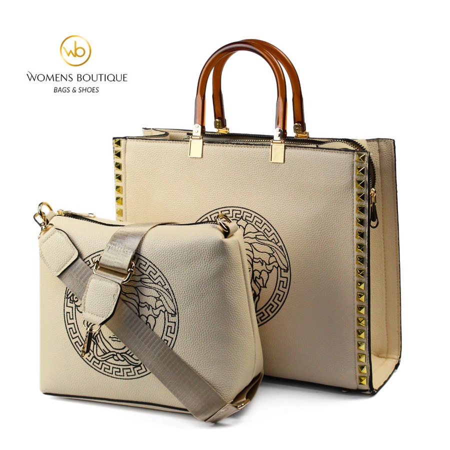 ✨ الوصف العام: اكتشف مجموعة WB الجديدة من حقائب اليد النسائية، المصممة بعناية لتجمع بين الفخامة والعملية. كل حقيبة تتميز بتصميم هندسي أنيق، مزينة بشعار الرأس الأسطوري المحاط بنقوش يونانية، مع لمسات من المسامير الذهبية التي تضيف طابعًا جريئًا ومميزًا.