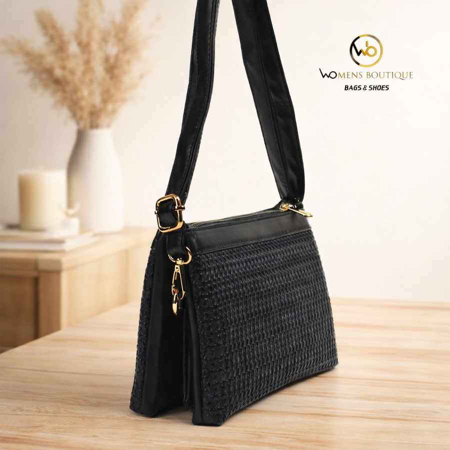 ج.محقيبة فاخرة بتصميم عصري يجمع بين الأناقة والعملية، مصنوعة من جلد مدكك إيطالي عالي الجودة يمنح ملمسًا فاخرًا ومتانة تدوم. تأتي بتفاصيل ذهبية أنيقة ولمسات منسوجة تضيف عمقًا بصريًا راقيًا، لتكون خيارك المثالي للإطلالات اليومية أو المسائية.