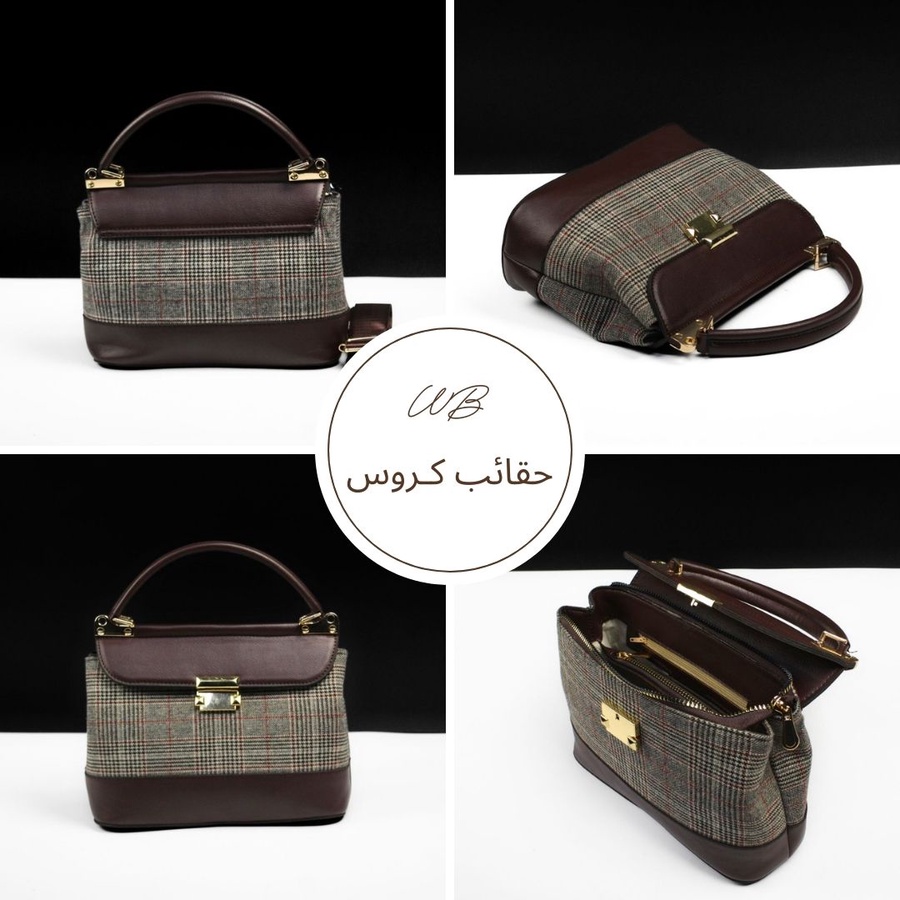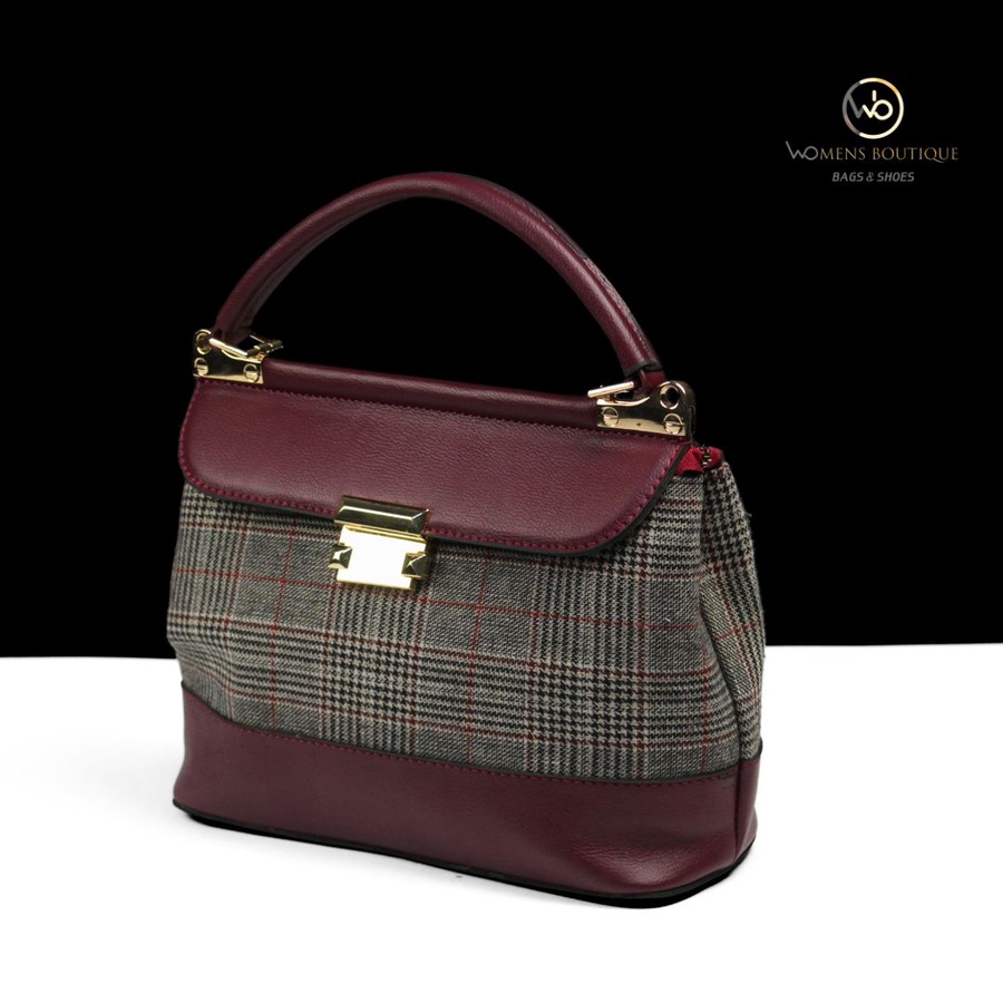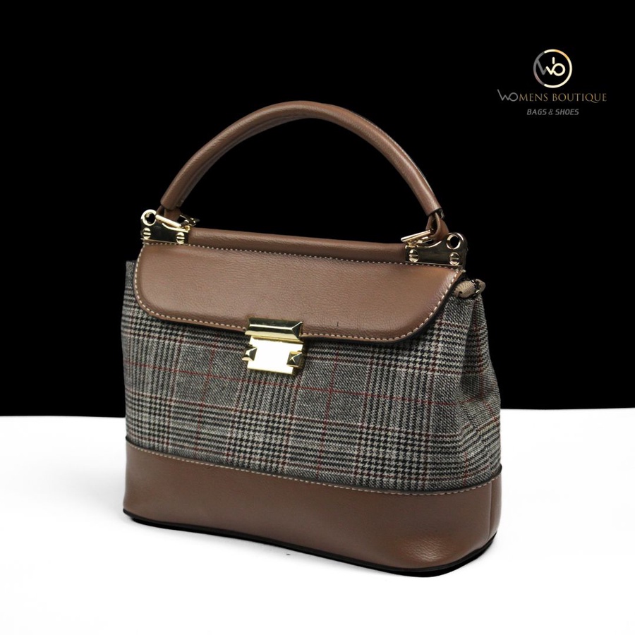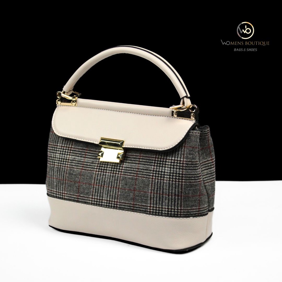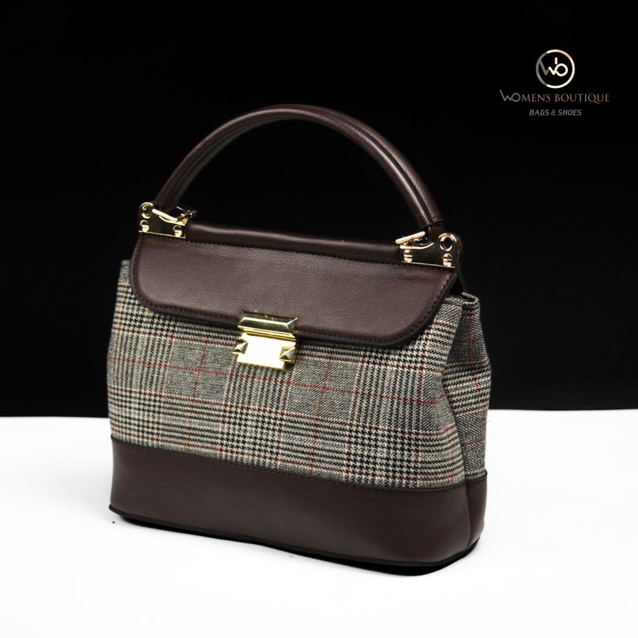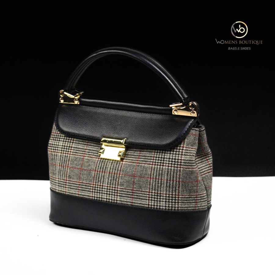 حقيبة يد أنيقة من مجموعة Women's Boutique Bags & Shoes تجمع بين القماش الكلاسيكي بنقشة المربعات باللونين الأسود والرمادي مع لمسات من الجلد الطبيعي الفاخر. تأتي بتصميم هيكلي أنيق مع قفل معدني ذهبي ولمسات فاخرة تجعلها مثالية للإطلالات الرسمية والعملية على حد سواء. حجمها المتوسط (28×20 سم) يجعلها عملية لحمل الأساسيات اليومية مع الحفاظ على مظهر راقٍ.