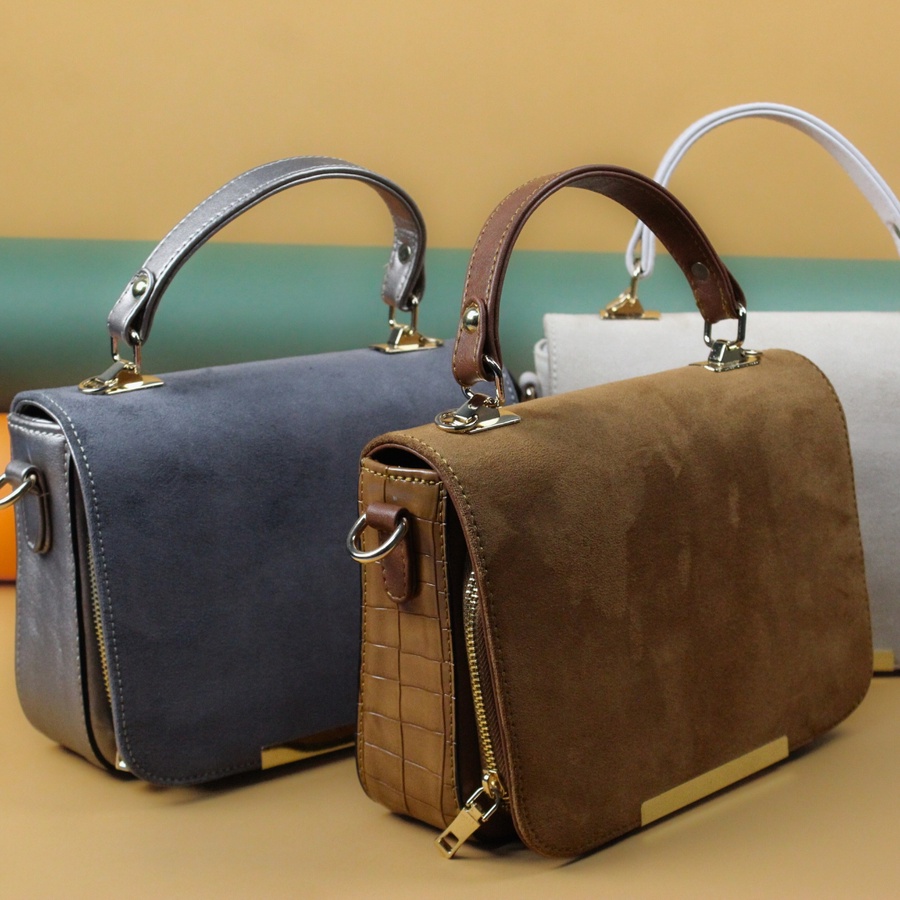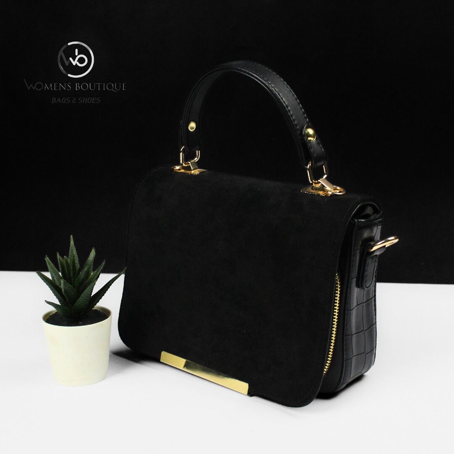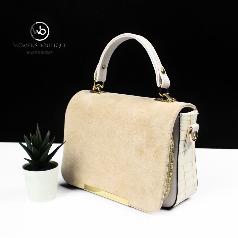 حقيبة يد بتصميم فاخر يجمع بين الشمواه الناعم وجلد الكروكو الجانبي، مع إكسسوارات ذهبية تضيف لمسة فخامة. حجم مثالي لإطلالاتك اليومية والمناسبات، بمقاس 28×18 سم. مقبض متين ولمسات أنيقة تجعلها قطعة لا غنى عنها في خزانة كل سيدة.