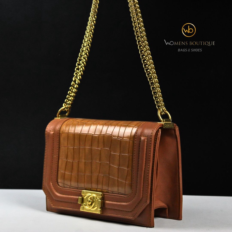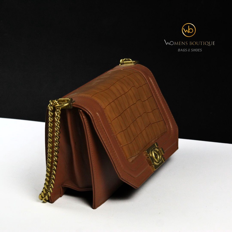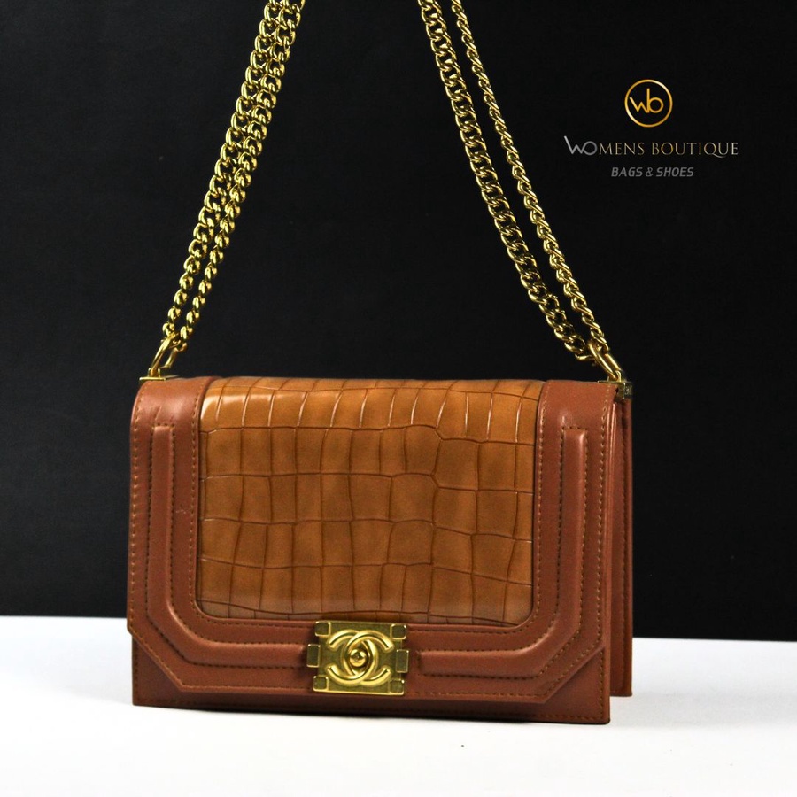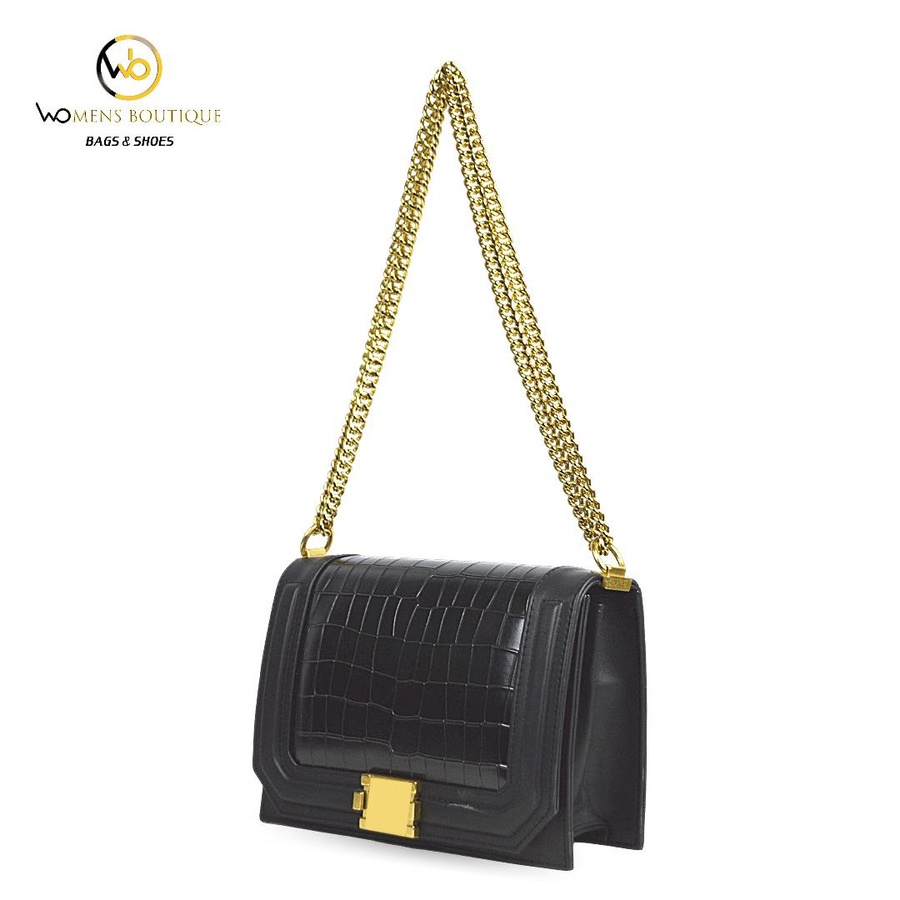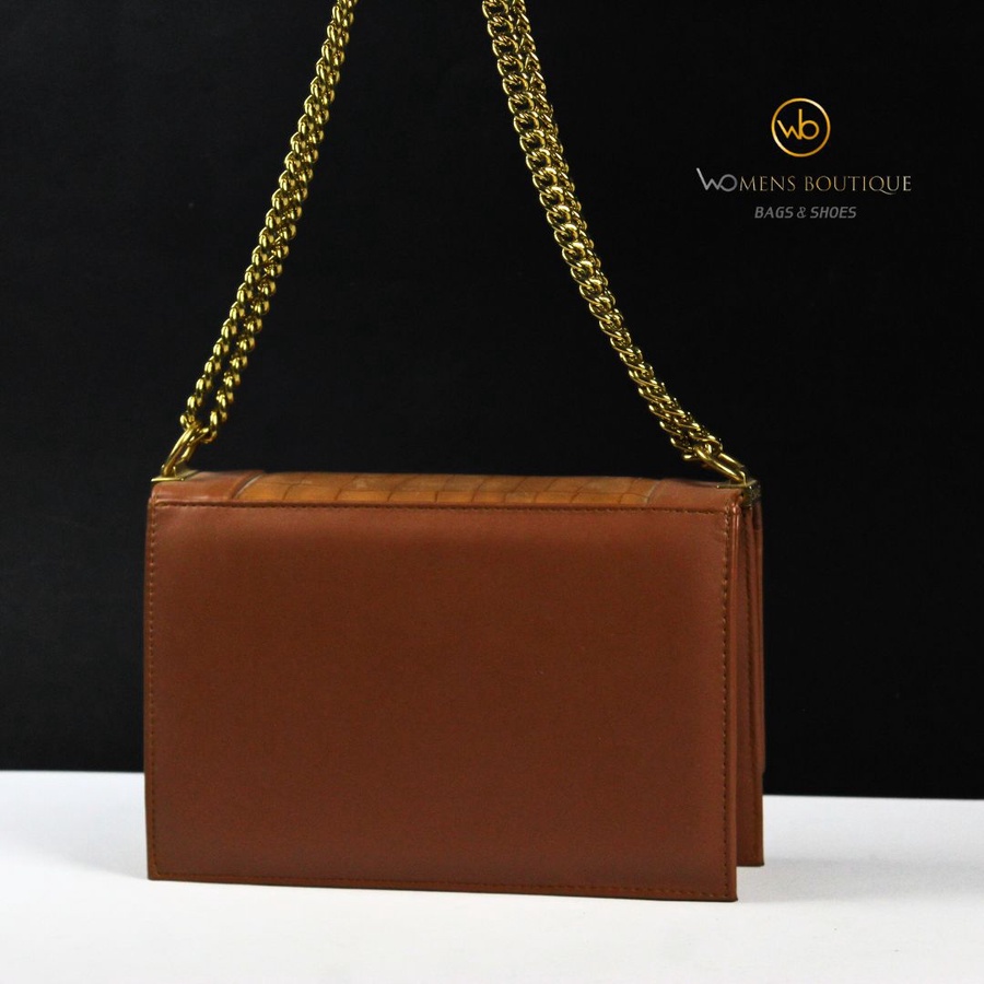 ج.محقيبة كتف أنيقة مصممة من خامة جلدية فاخرة بنقشة الكروكو الراقية، تأتي بتفاصيل معدنية ذهبية ولمسة فخامة في التصميم. عملية وعصرية، وتُعد اختيارًا مثاليًا للإطلالات اليومية والسهرات.