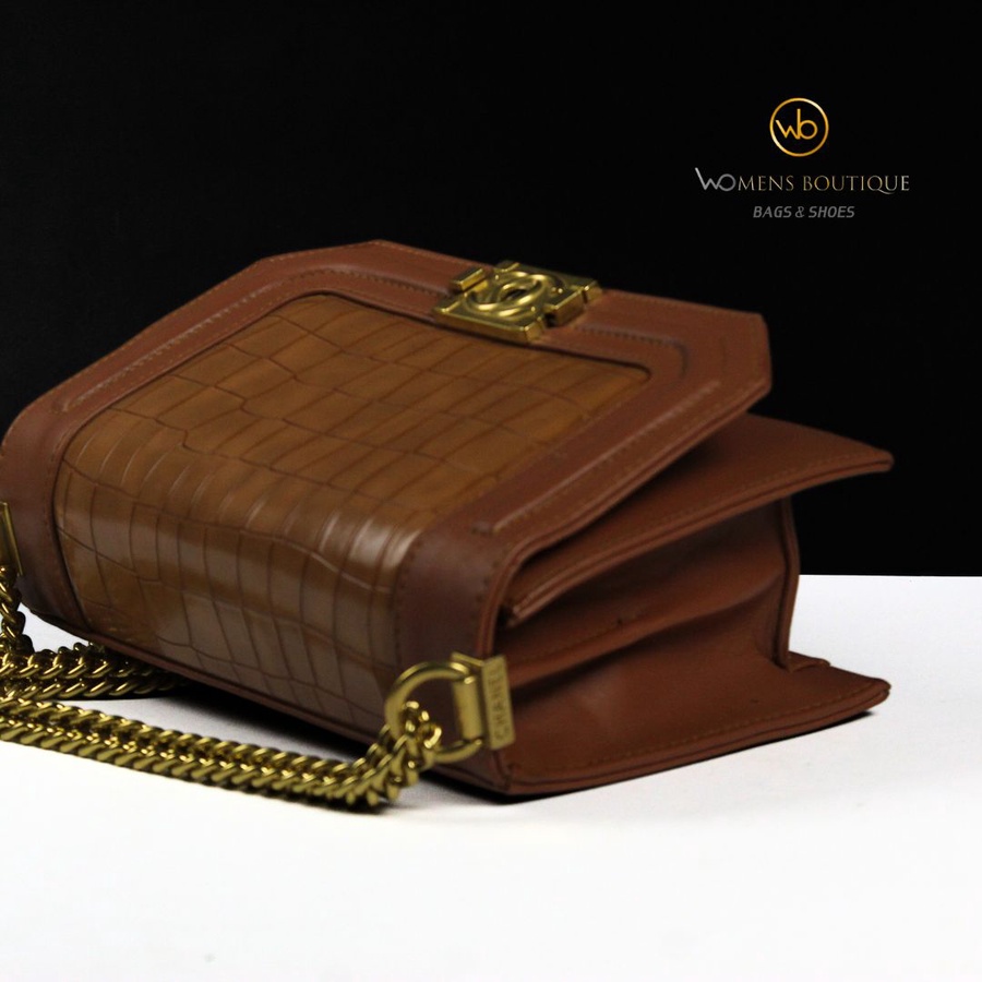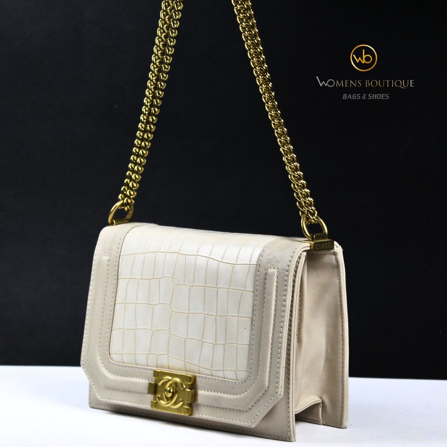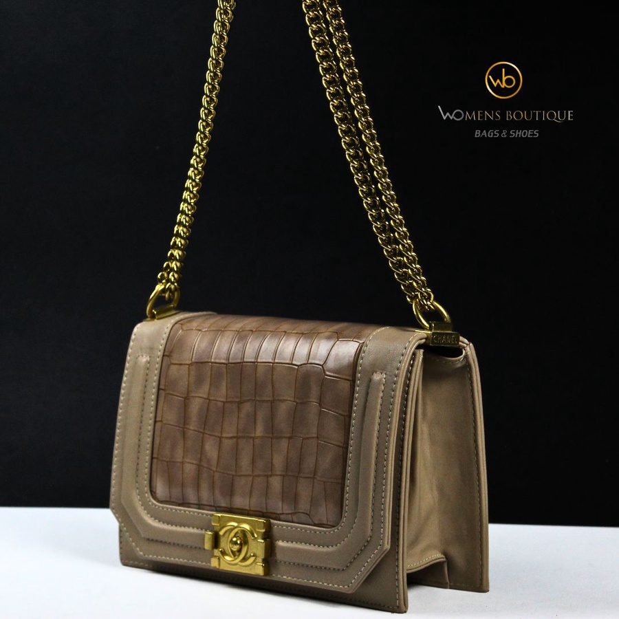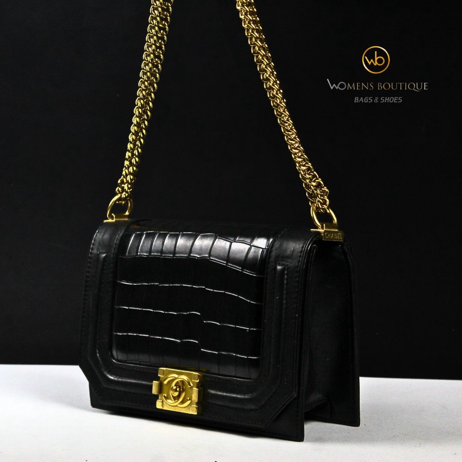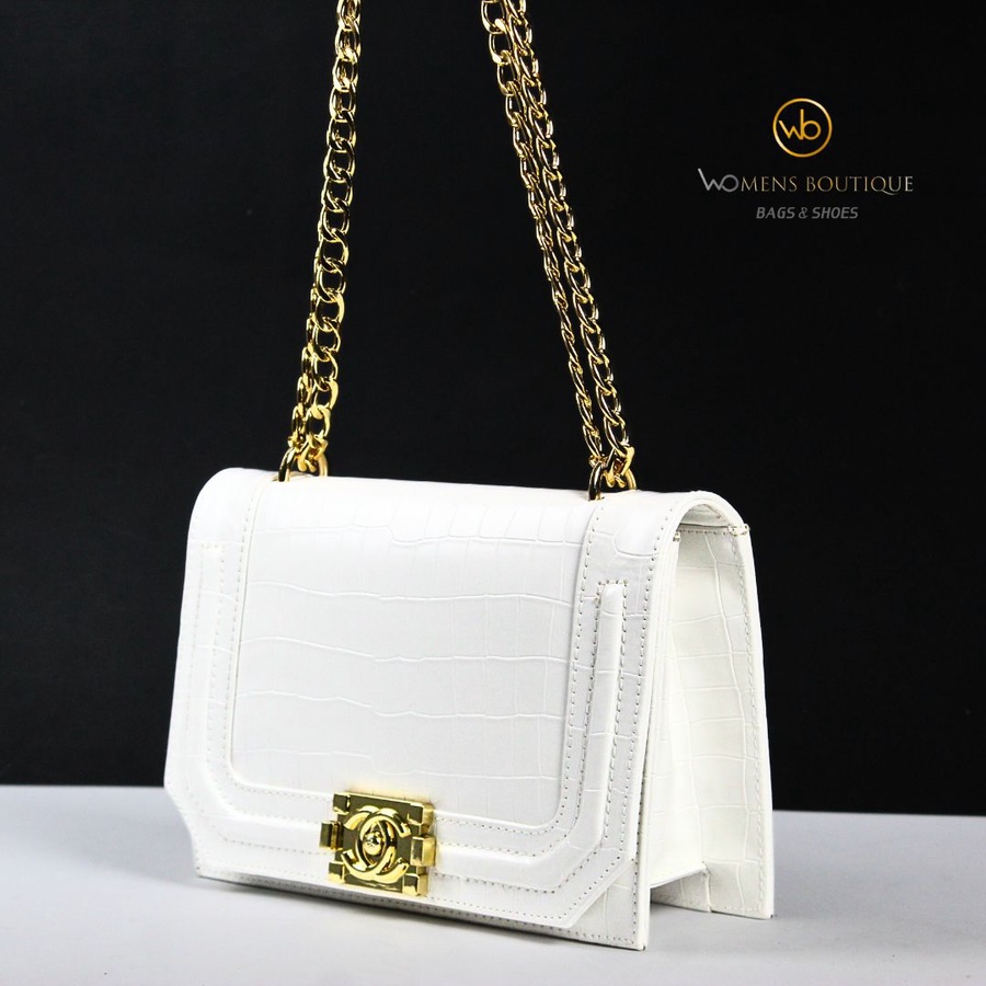 ج.محقيبة كتف أنيقة مصممة من خامة جلدية فاخرة بنقشة الكروكو الراقية، تأتي بتفاصيل معدنية ذهبية ولمسة فخامة في التصميم. عملية وعصرية، وتُعد اختيارًا مثاليًا للإطلالات اليومية والسهرات.