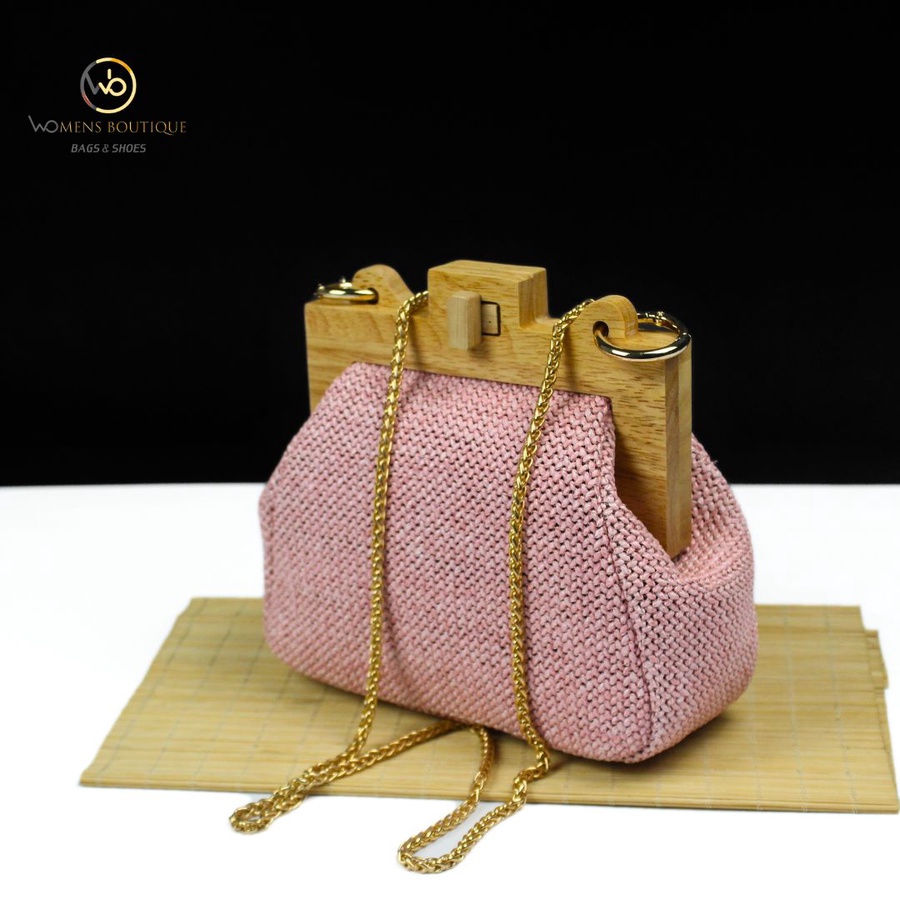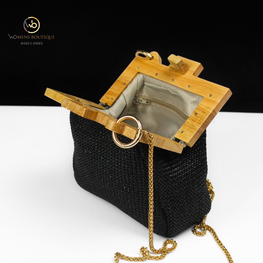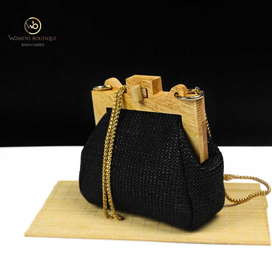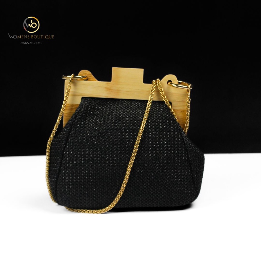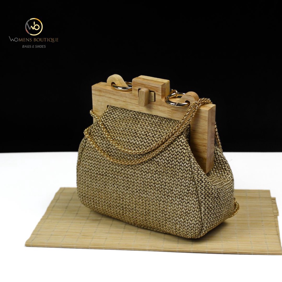 المادة: السطح الخارجي للحقيبة يبدو مصنوعًا من مادة بنسيج مميز (ربما جلد صناعي أو قش منسوج بدقة) يعطيها مظهرًا عصريًا وملمسًا فريدًا. الحواف المعدنية (يبدو أنها فضية اللون) تضيف لمسة من الرقي والمتانة.