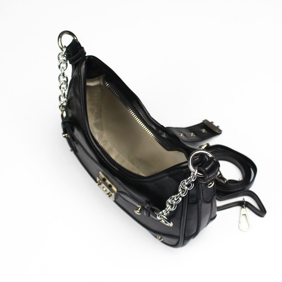 حزام كتف مزدوج: تأتي الحقيبة بحزام كتف يجمع بين الجلد الصناعي الناعم وسلسلة معدنية فضية اللون، مما يمنحها مظهرًا عصريًا ويضيف إليها لمسة من اللمعان. يمكن تعديل الحزام ليلائم طرق حمل مختلفة (على الكتف أو كروس بودي).